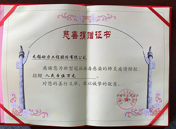无锡动力心系肺炎疫情,积极承担社会责任,向无锡市锡山区厚桥街道慈善会捐赠人民币伍万元。另外,由万迪集团综合党支部发起,卡仕精密公司参与,党员和群众共同筹集善款,计划采购物资向武汉肺科医院捐赠医疗转运平车6台左右。